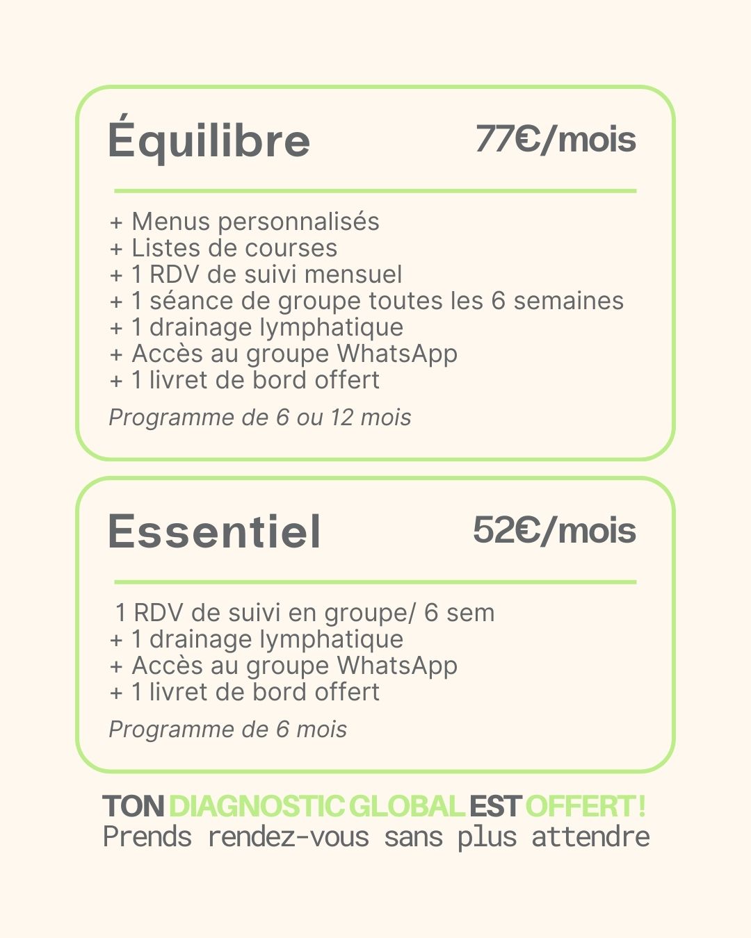 À la fin de ce rendez-vous, tu auras toutes les clés pour choisir la formule la plus adaptée à ton rythme de vie. L’objectif ? Mettre en place ensemble une stratégie simple et agréable, pour que tu retrouves un bien-être durable, sans privation ni stress.
