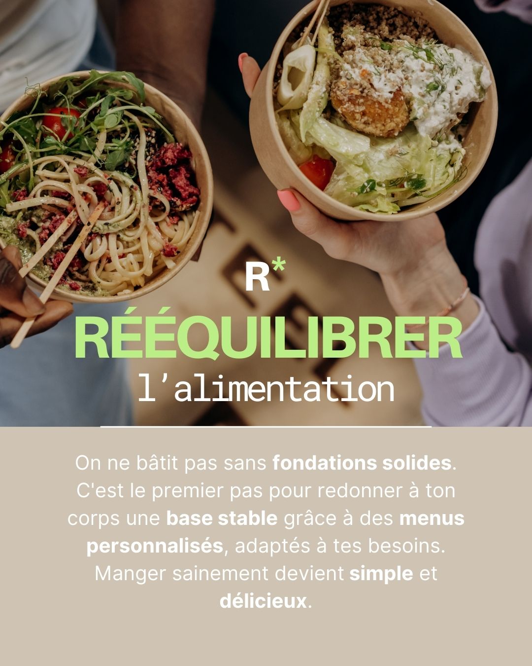On ne bâtit pas sans fondations solides. C’est le premier pas pour redonner à ton corps une base stable grâce à des menus personnalisés, adaptés à tes besoins. Manger sainement devient simple et délicieux.